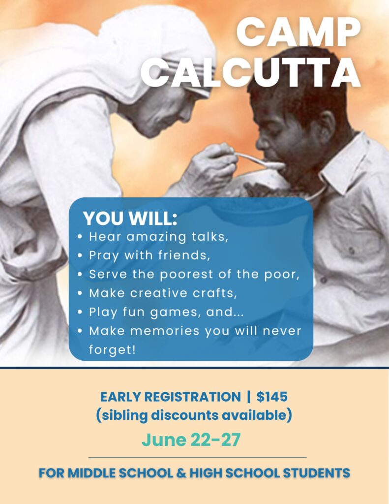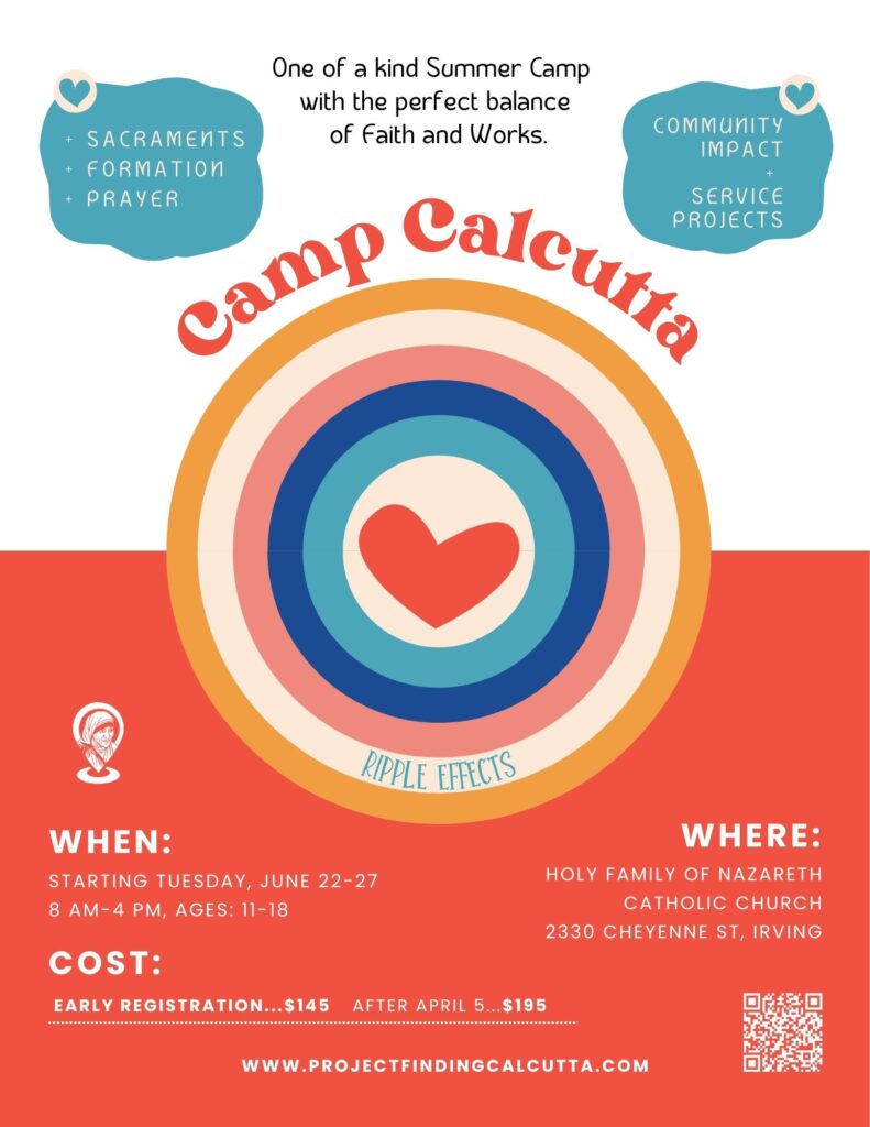 Camp Calcutta goes from Monday to Saturday (June 22-27). All Middle School and High School children may join this camp. Everyday the parents are encouraged to drop off the kids at 8 AM and pick up at 4 PM at Holy Family of Nazareth Catholic Church in Irving, TX. Lunch will be provided.
